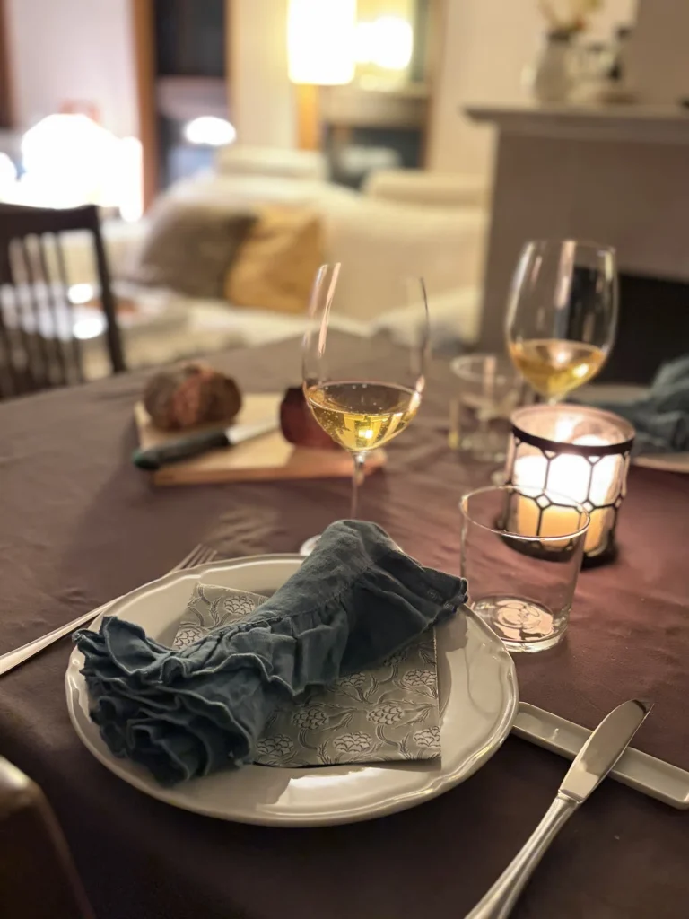 この日はブラウングレーのクロスをかけて、シンプルな白いお皿、ブルーグリーンのナプキン。灯りを少し落としてキャンドルとフロアランプだけ。中心は夫の出身地のチーズであるコンテ。美味しいパンは2種。丸ごとは2人には多いので1/2本で購入します。ここにパテや牛肉のゼリー寄せみたいな作り置きの前菜と蕪のサラダというディナーでした。