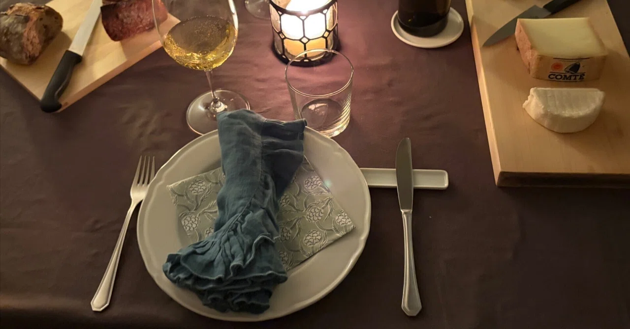 この日はブラウングレーのクロスをかけて、シンプルな白いお皿、ブルーグリーンのナプキン。灯りを少し落としてキャンドルとフロアランプだけ。中心は夫の出身地のチーズであるコンテ。美味しいパンは2種。丸ごとは2人には多いので1/2本で購入します。ここにパテや牛肉のゼリー寄せみたいな作り置きの前菜と蕪のサラダというディナーでした。