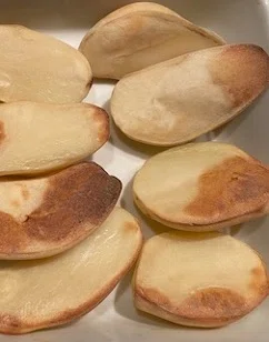 4. 付け合わせのジャガイモは洗って皮を剥き、半分に切る。鶏を焼く時のオーブンに一緒に入れる。