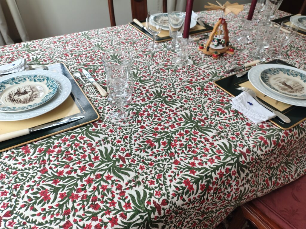 まだ家族は寝ている元旦の朝、そっとサラマンジェ(食堂)に降りて行って、ぱぁーっとクロスをテーブルの上に広げます。一つ一つのアイテムを置いていくと、テーブルが生き生きしてくるのを感じます。セッティングが終わり、全体を眺めると、わたしもだらだらが消え、しゃきっとしていて。