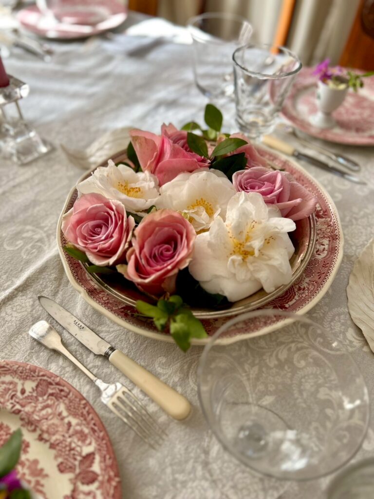 そこから、テーブルクロスを考え、花を考え、なんなら、お料理もテーマカラーに合うものは何だろうと、半ば本末転倒な考えをすることもあります。冒頭の写真は、ピンクをテーマカラーにしたテーブルです。